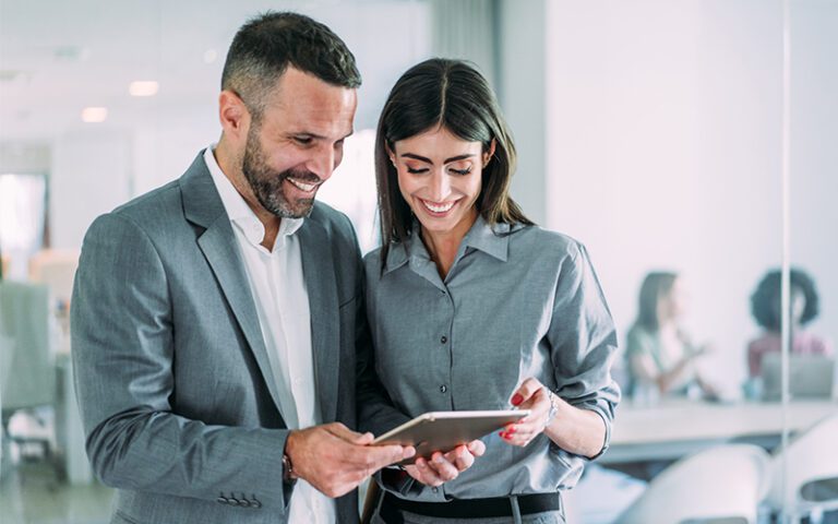 Two professionally dressed colleagues standing close together, smiling while looking at a tablet device in a modern office setting.